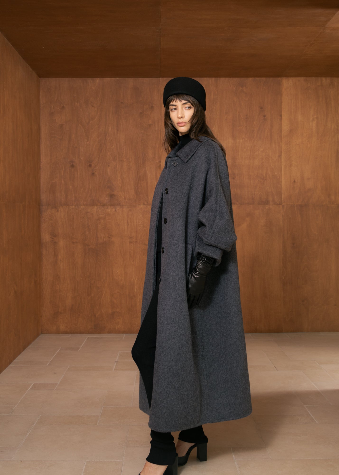 This single-button coat features a streamlined silhouette, it combines timeless style with modern minimalism. Handcrafted from a double-faced fabric blend of merino wool, rabbit fur, and alpaca wool.