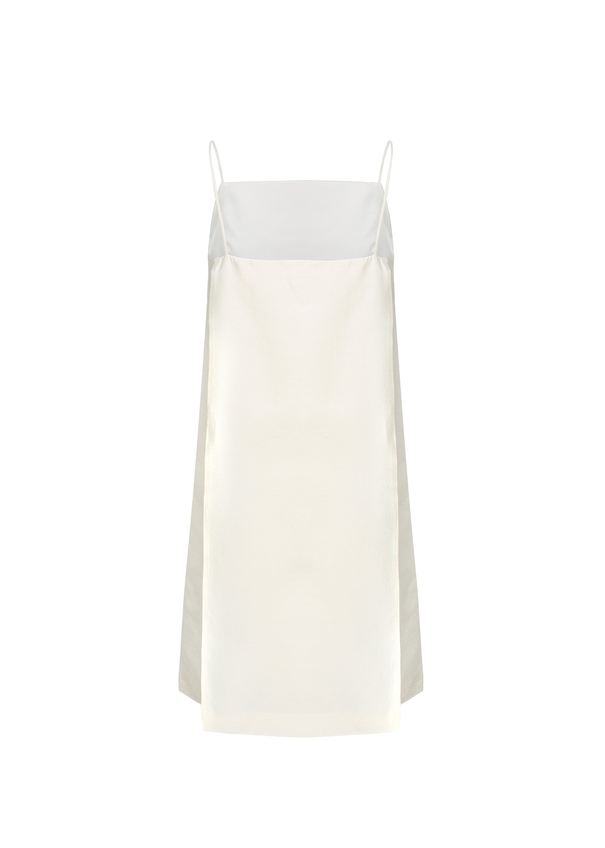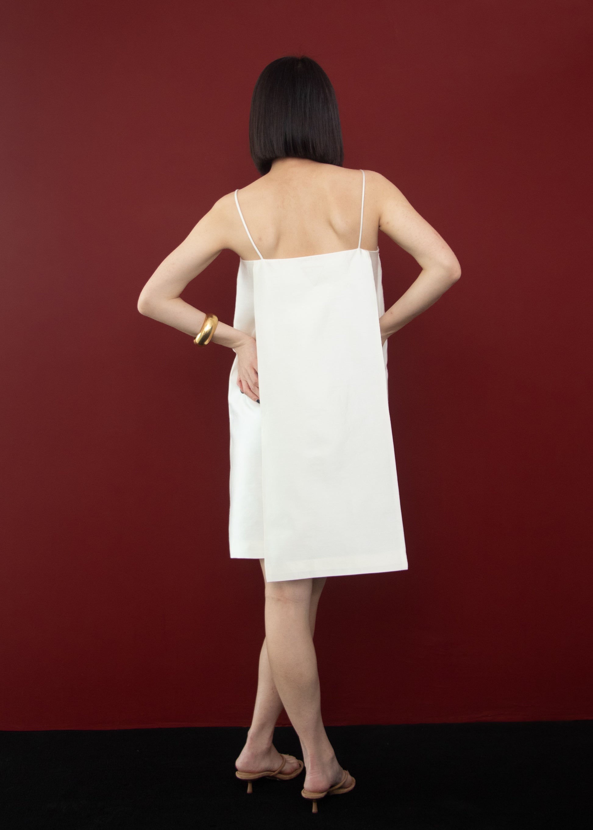 Cut in a refined wool-silk blend, this strapless silhouette flows from a clean bodice into a quietly architectural back panel—an unexpected extension that echoes the calm fall of natural fabric.
