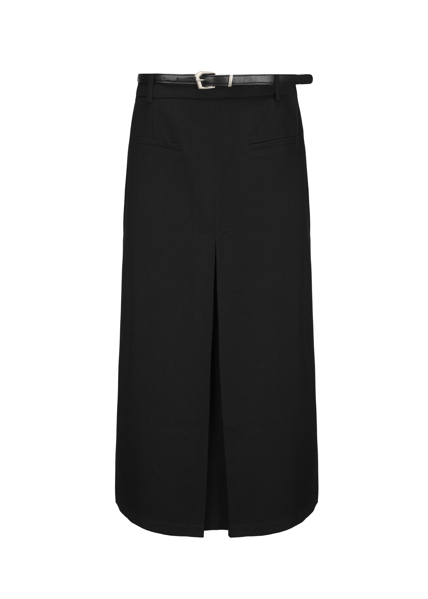 The Signature Woven A-Line Skirt features a delicate belt and central split seam, blending classic structure with modern elegance for versatile styling.