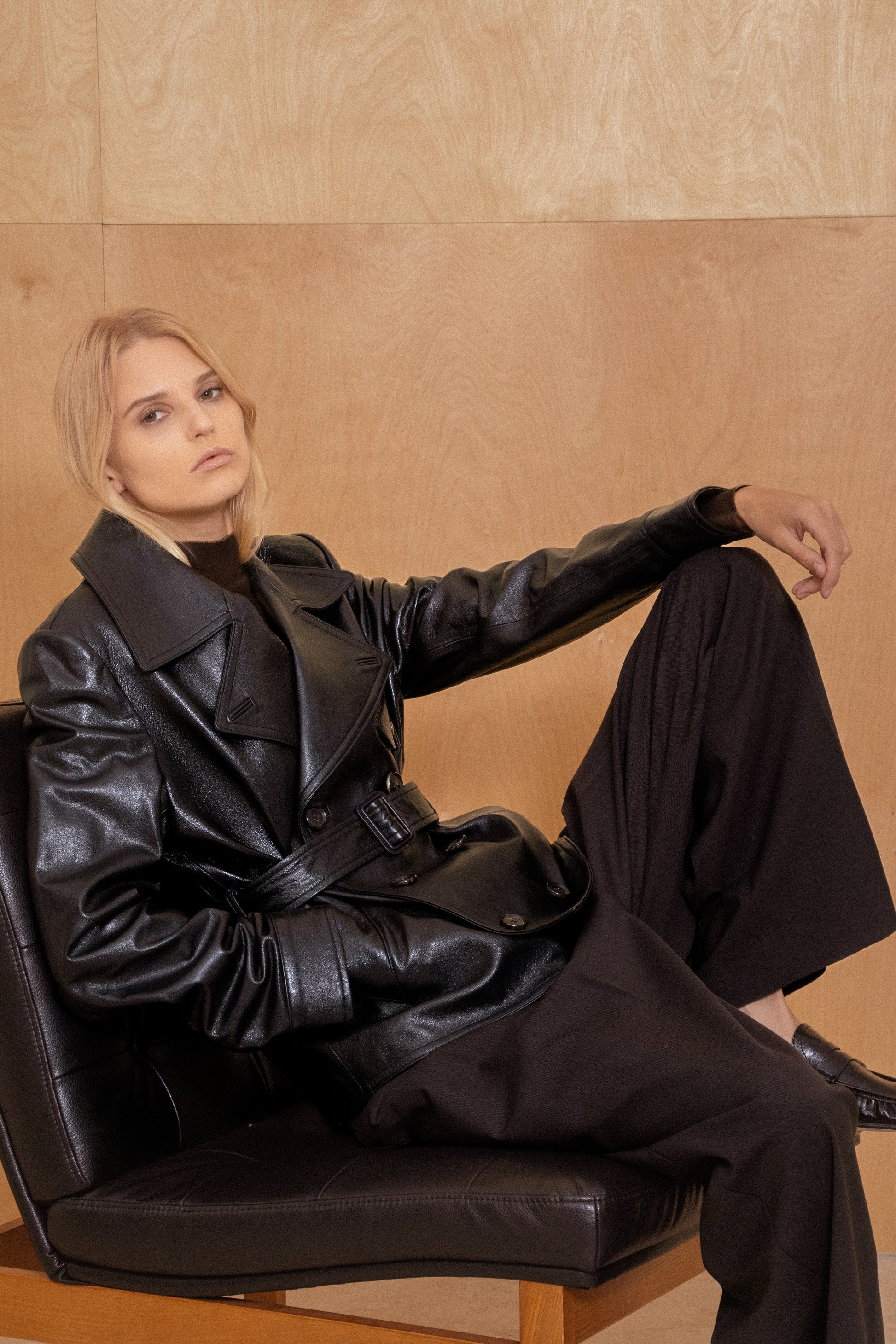 Crafted from lambskin, the Alondra Jacket features a wide lapel, double-breasted front, and a structured belt for a defined silhouette. Its polished finish and clean lines create a timeless, modern statement.