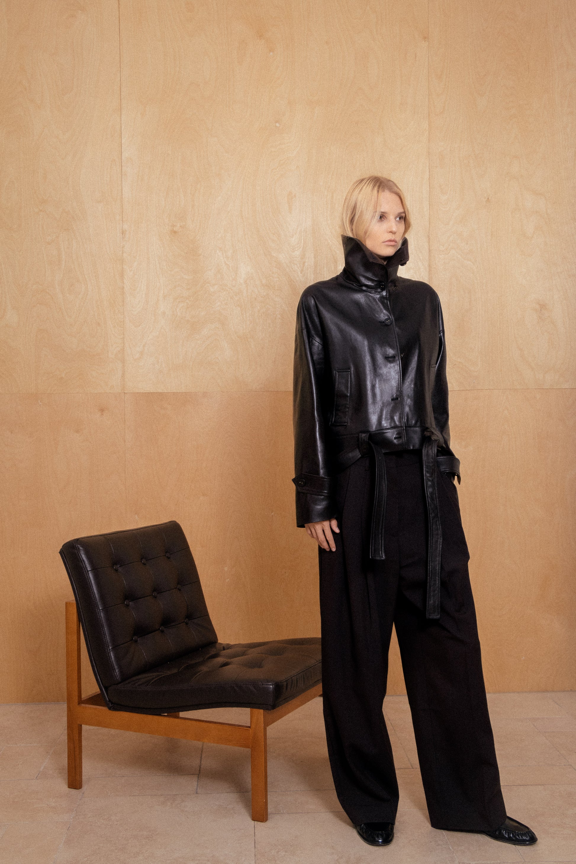 Crafted from lambskin, The Eleanora Jacket features a structured stand collar, clean button front, and adjustable waist belt. Its cropped silhouette and subtle sheen bring modern refinement to a timeless piece.
