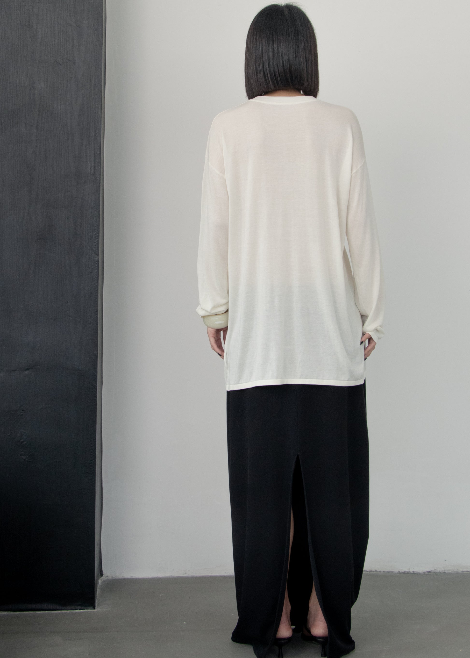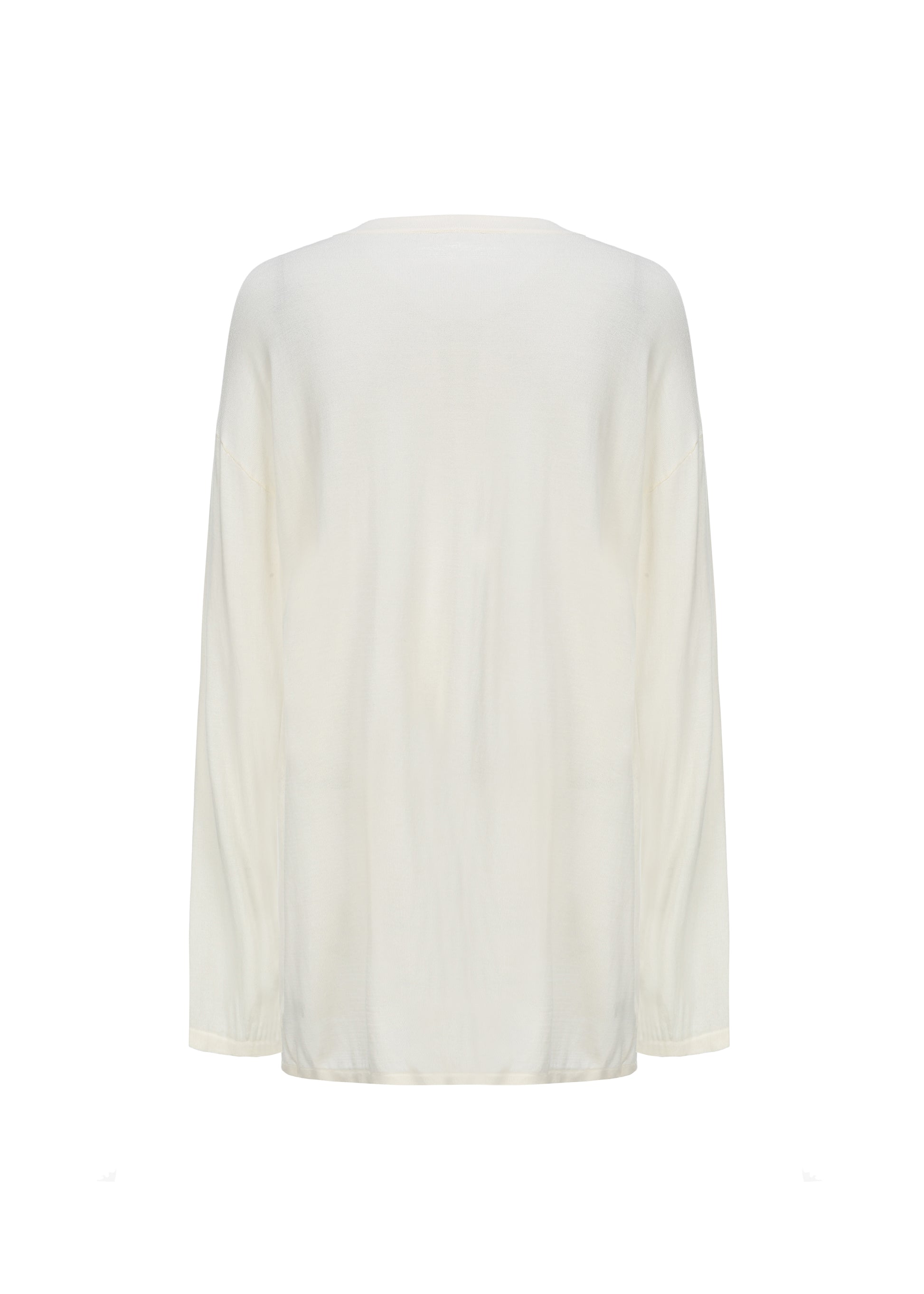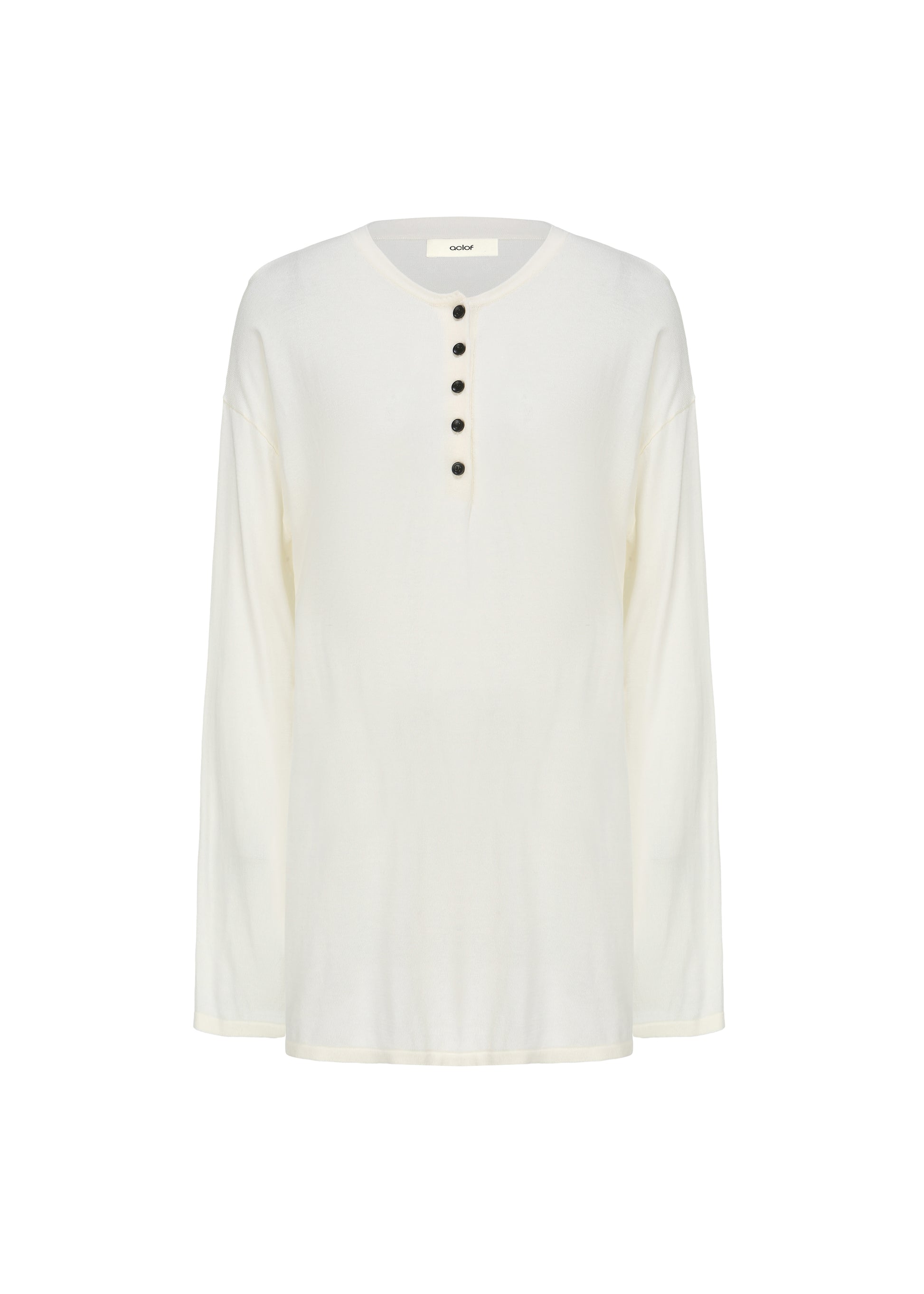 Crafted from 100% fine wool, this long-sleeve T-shirt drapes naturally with a soft knit texture. The buttoned neckline adds quiet elegance to a minimalist silhouette.