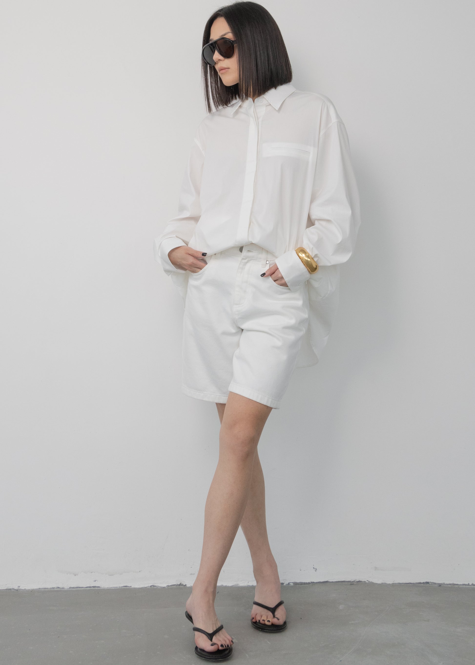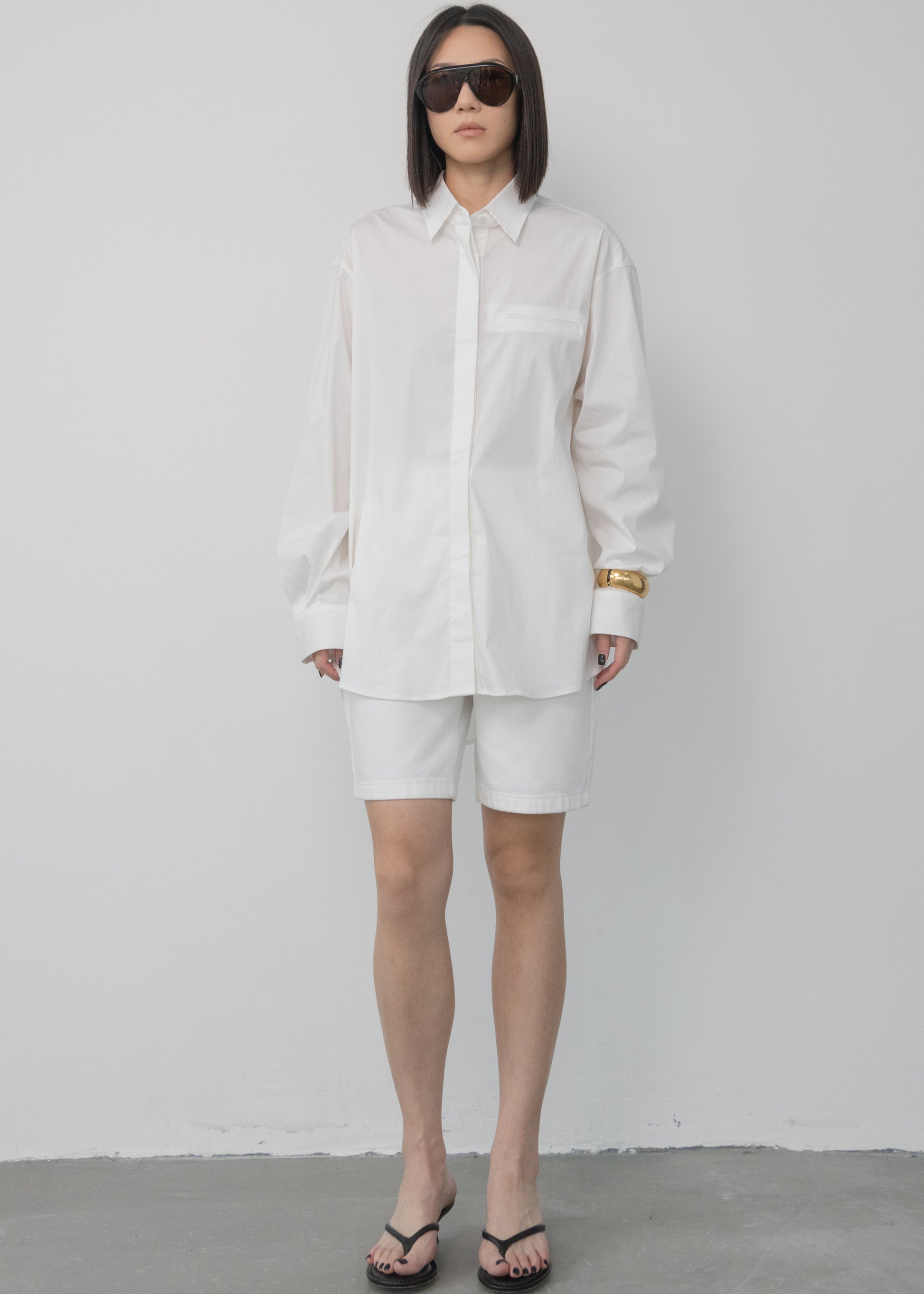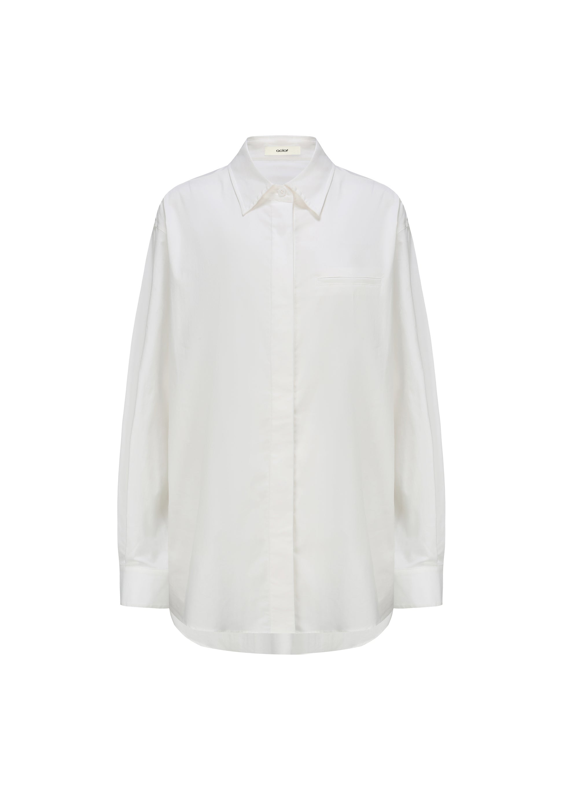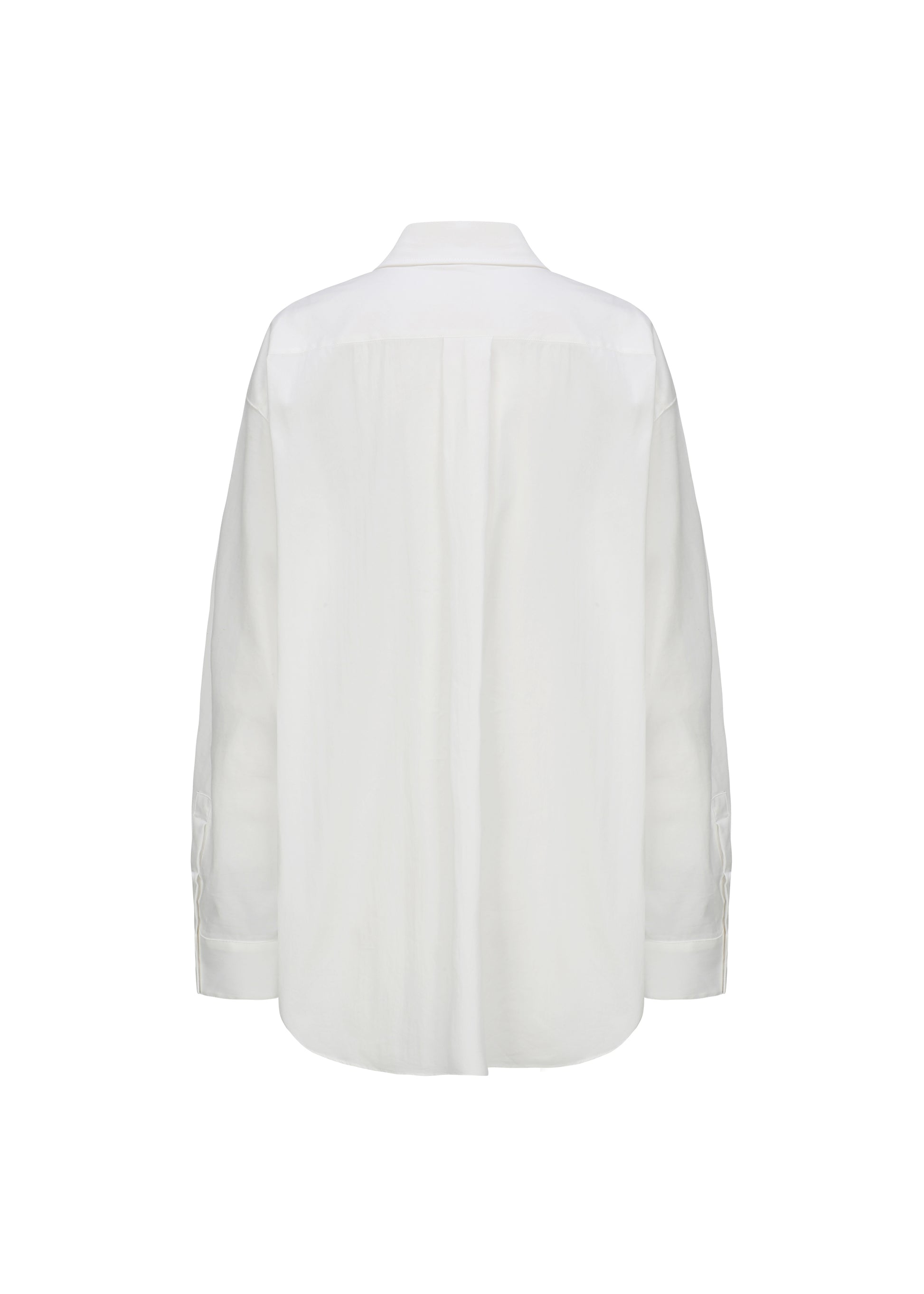 A crisp white shirt in soft, breathable fabric. The relaxed cut is finished with a subtle curved hem at the back—quietly refined, endlessly versatile.