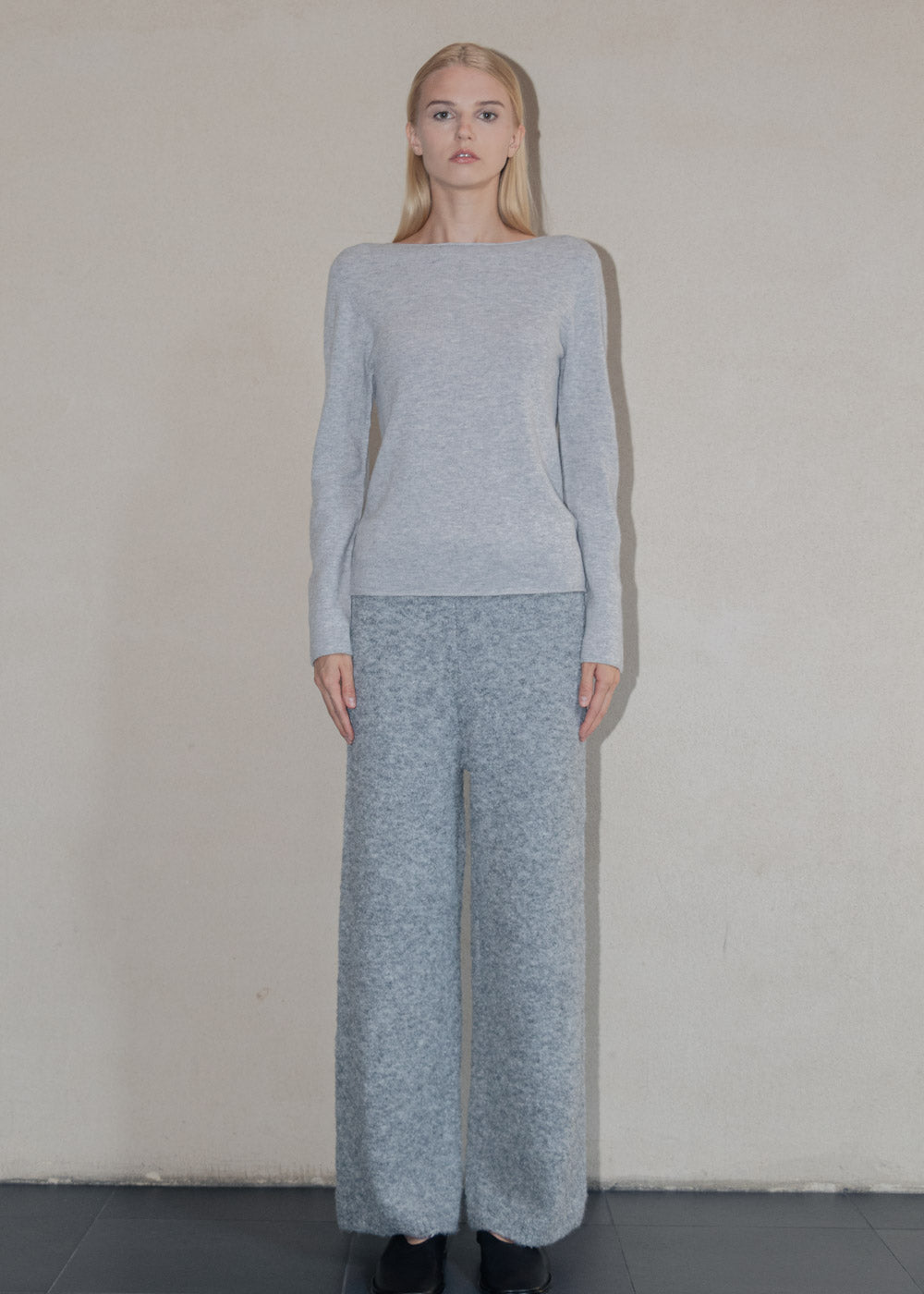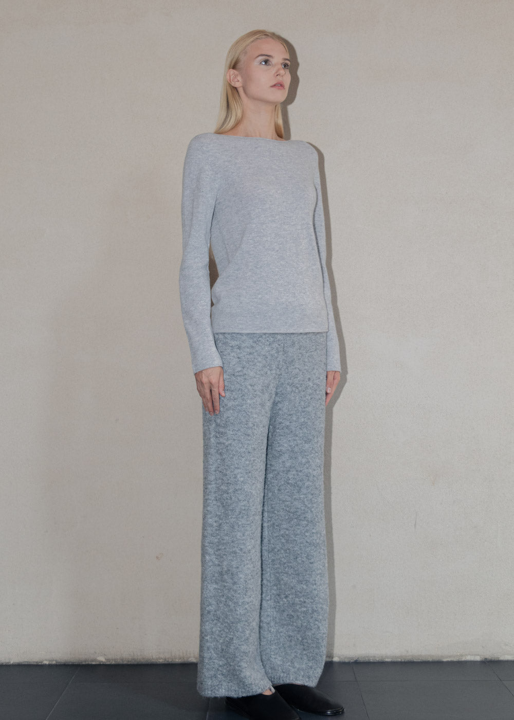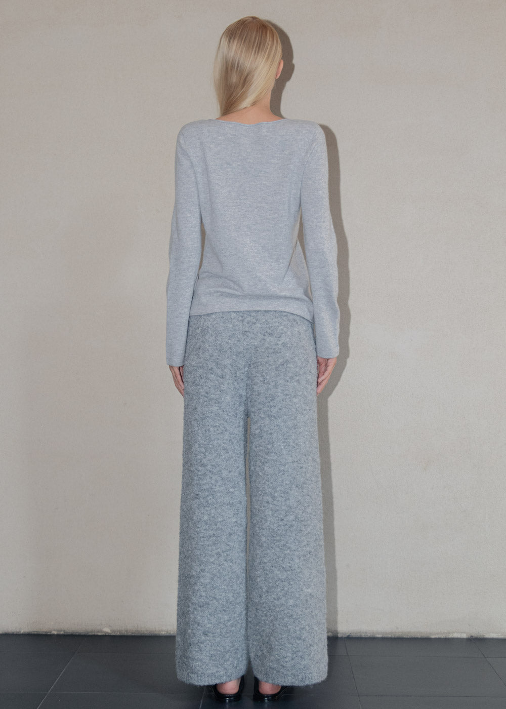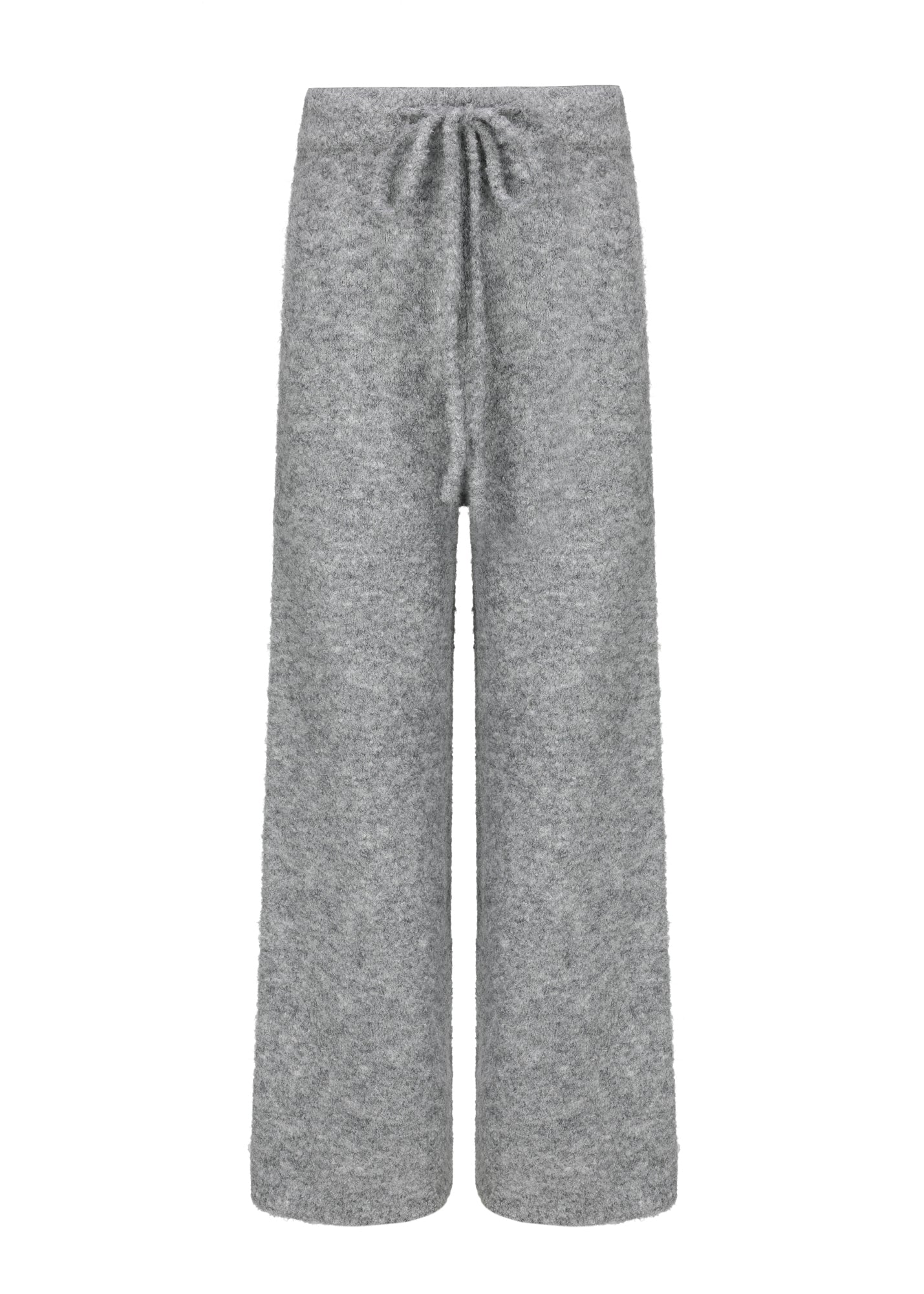 Bouclé style fabric with a relaxed wide-leg fit and drawstring waist, offering comfort and style for any sophisticated occasion.