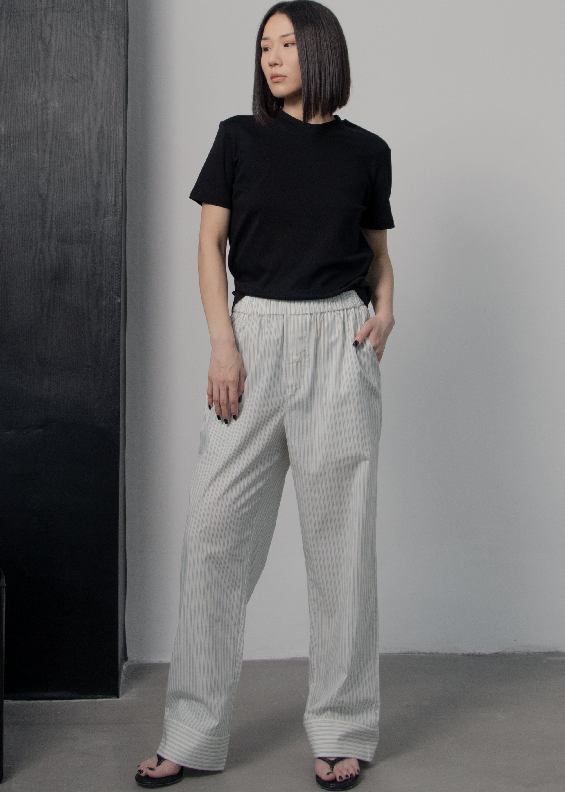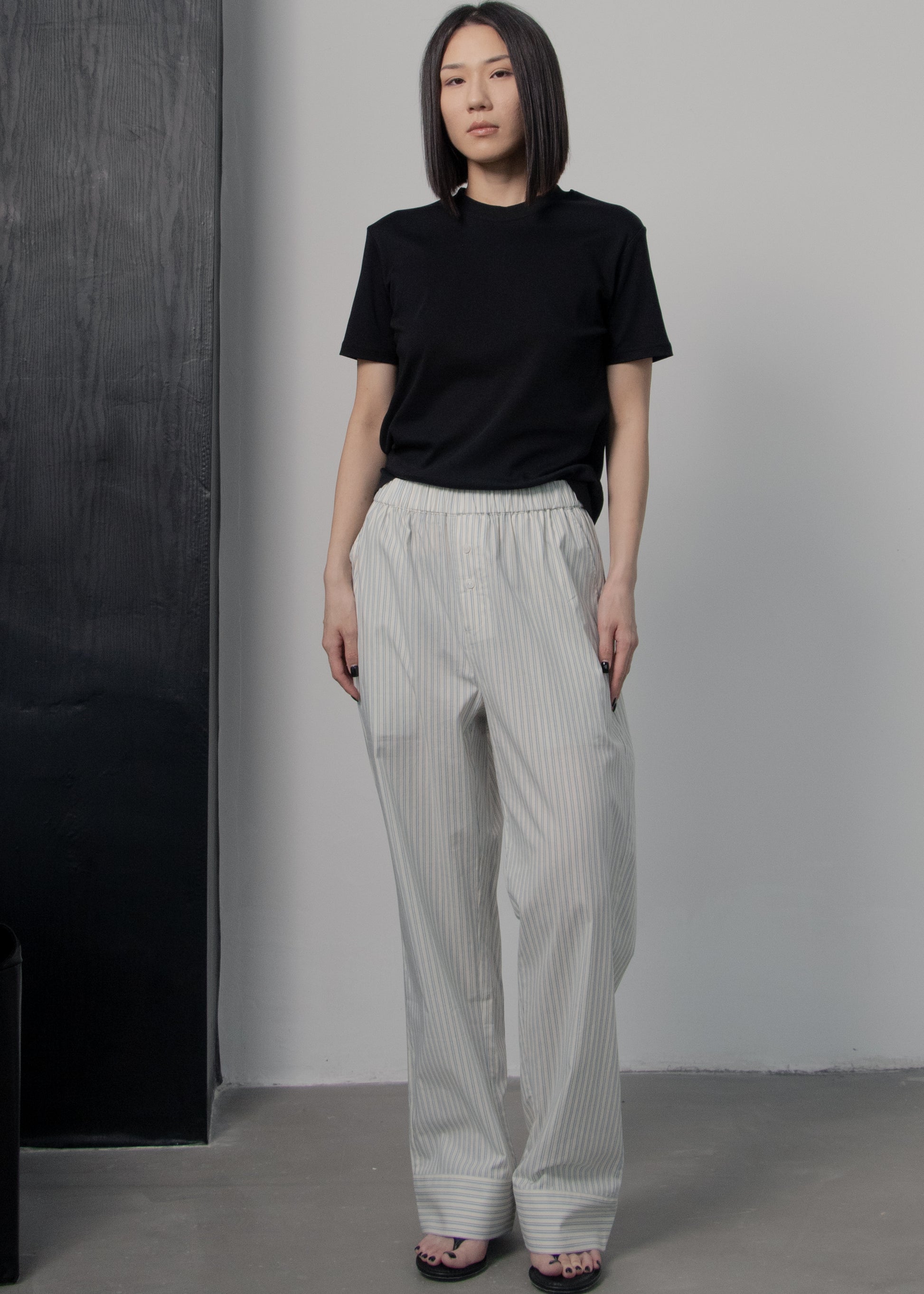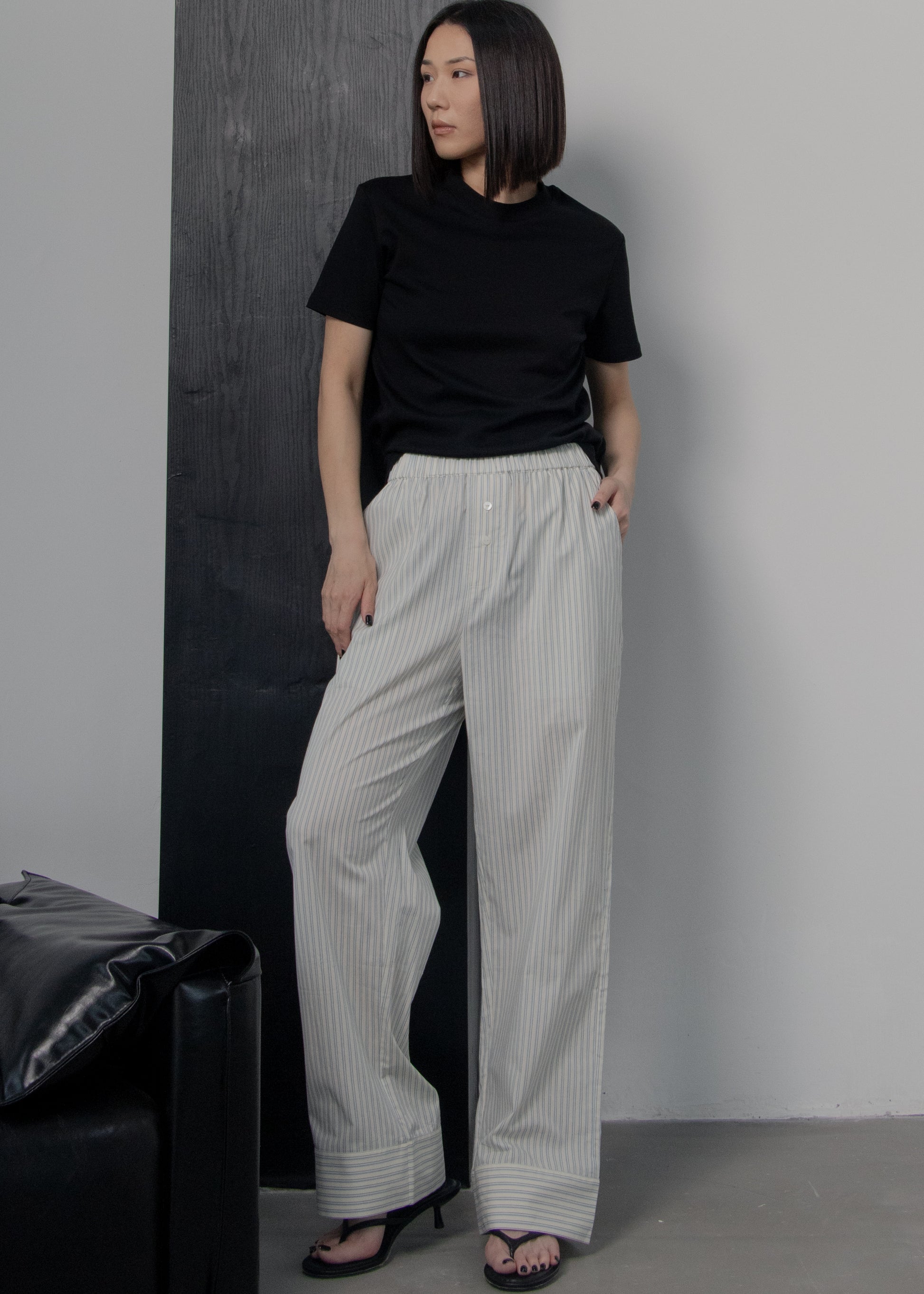 Cut from crisp premium cotton with a subtle striped design, the Selby Trousers offer an easy balance of structure and ease. Ideal for off-duty days and polished everyday looks alike.