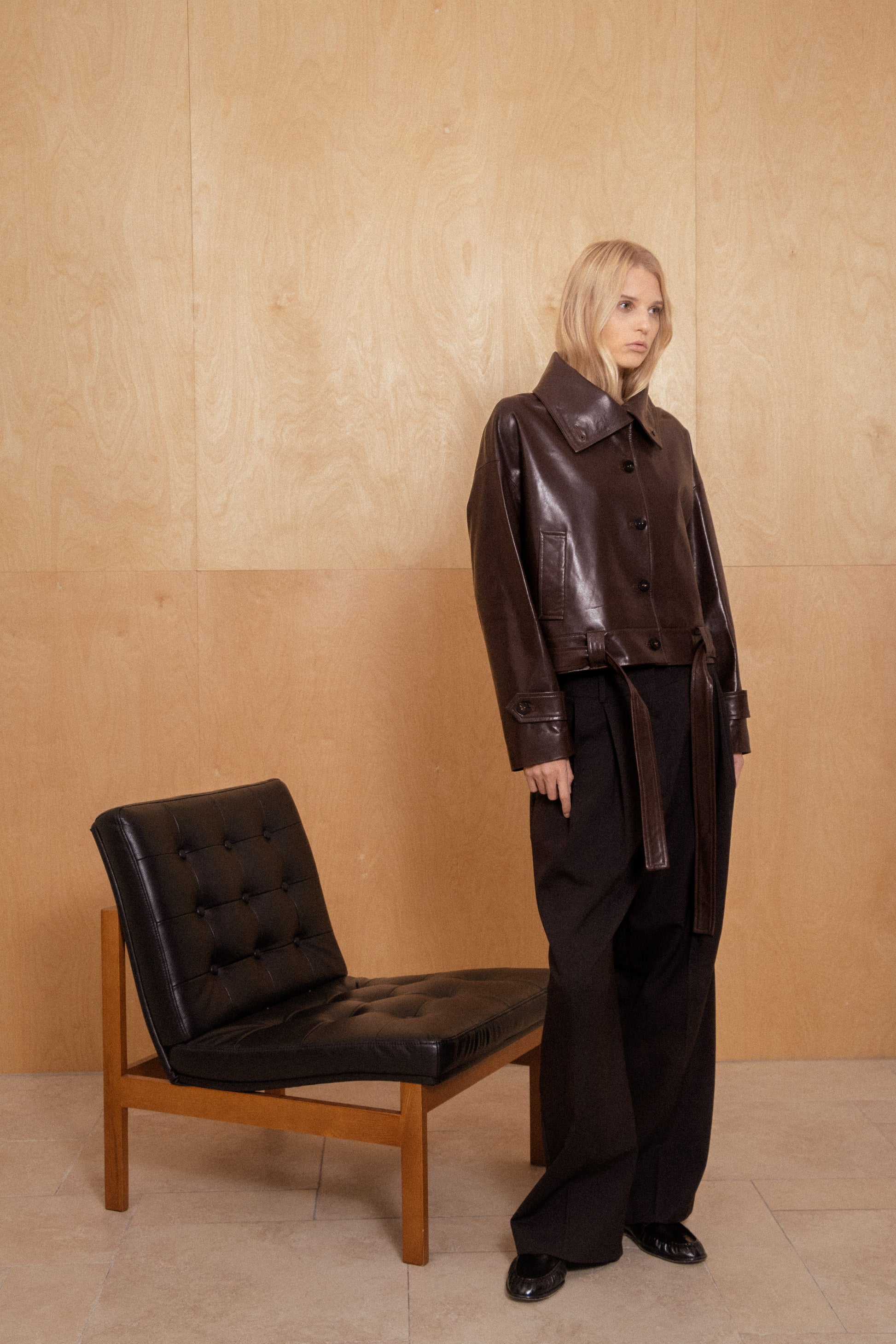 Crafted from lambskin, The Eleanora Jacket features a structured stand collar, clean button front, and adjustable waist belt. Its cropped silhouette and subtle sheen bring modern refinement to a timeless piece.