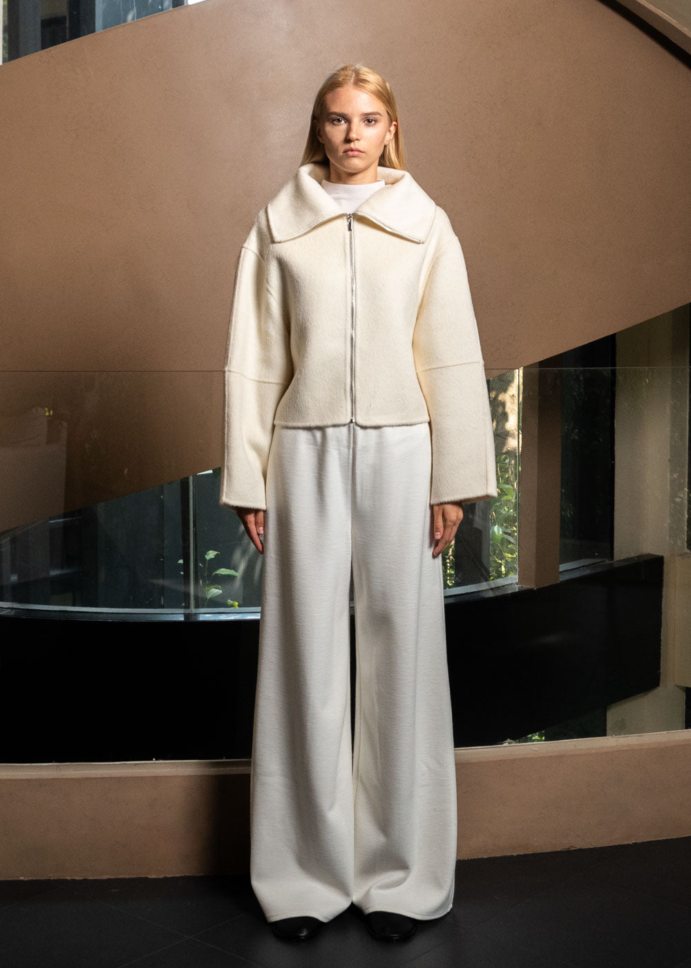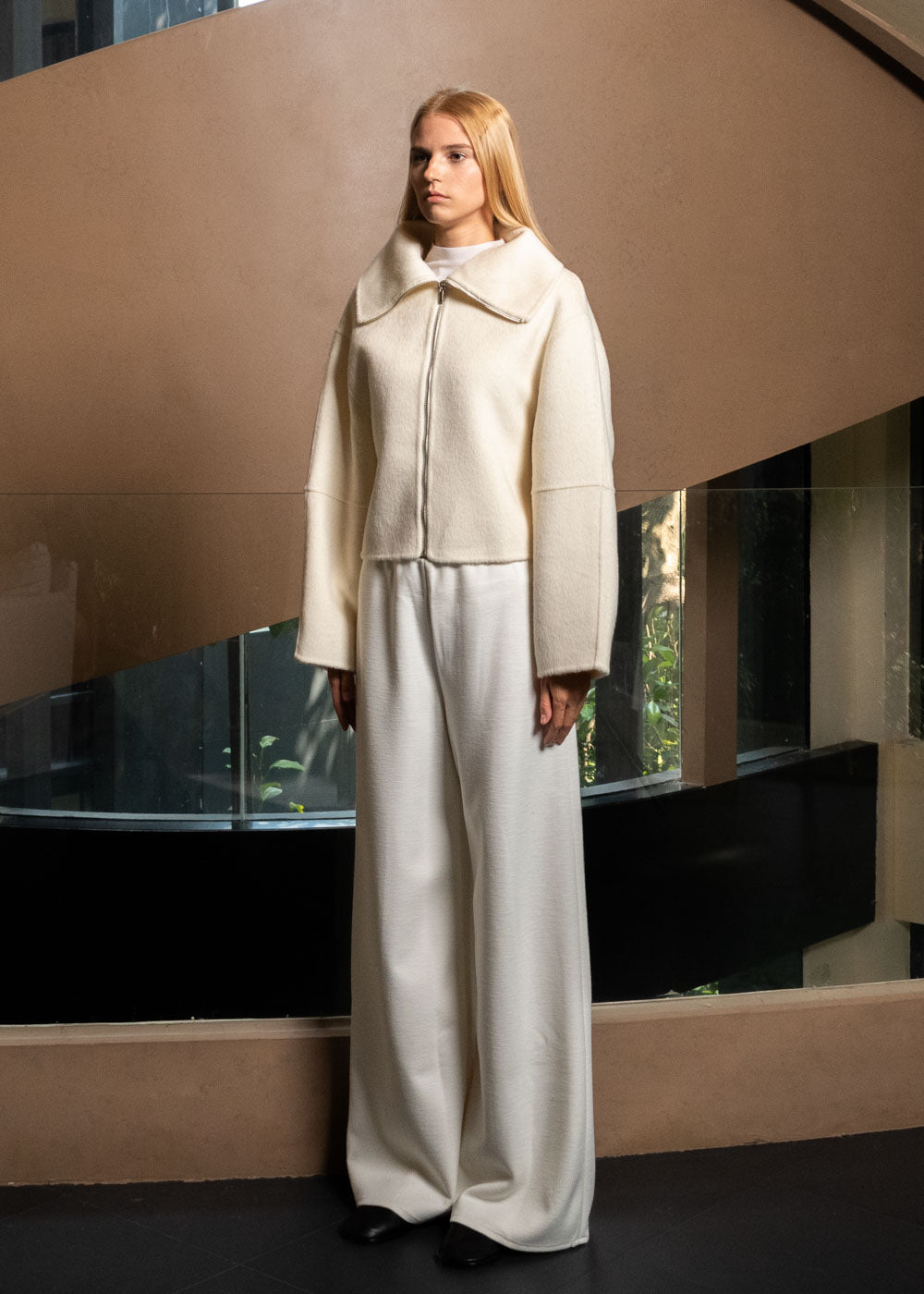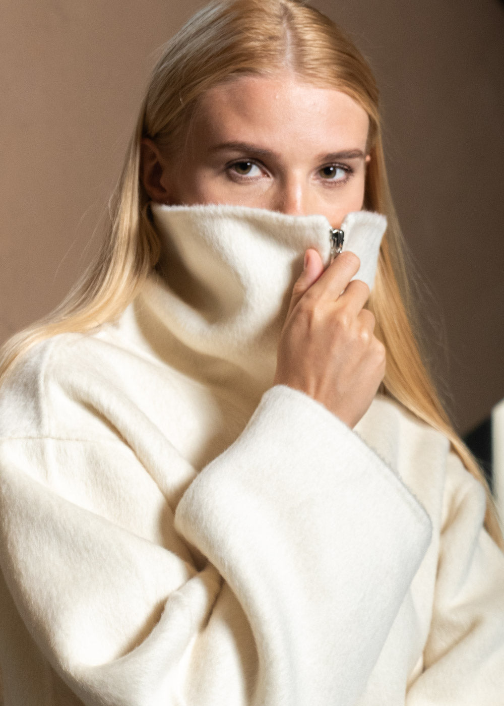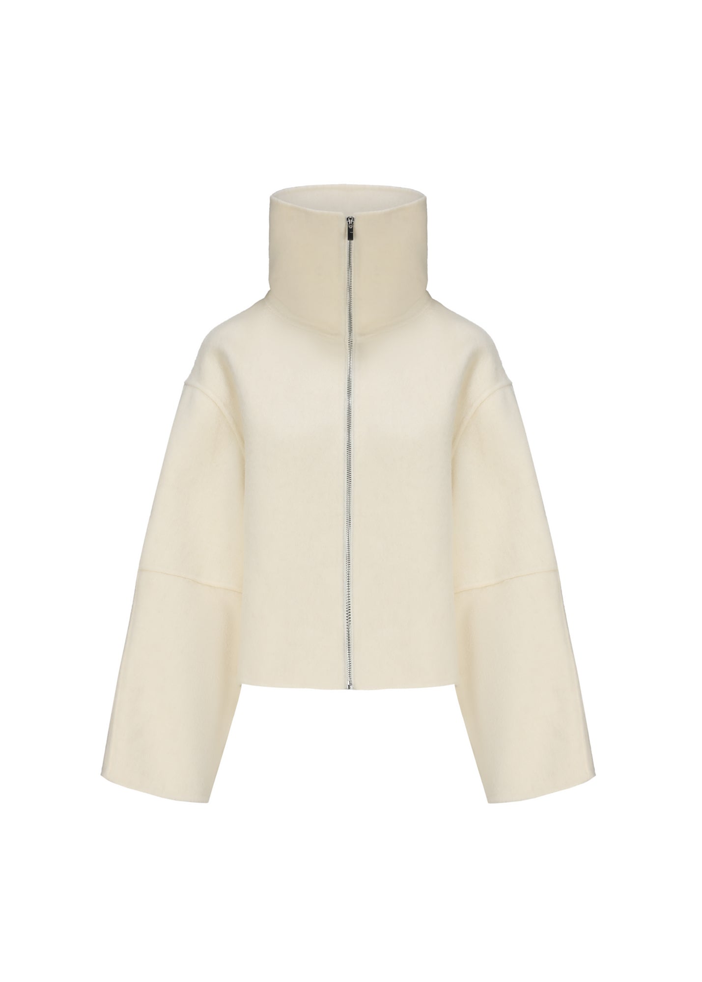 Handcrafted from a double-faced fabric blend of merino wool, rabbit fur, and alpaca wool, the wide sleeves and high-neck with extended zipper showcase a structured, modern silhouette that perfectly blends warmth, softness, and style.