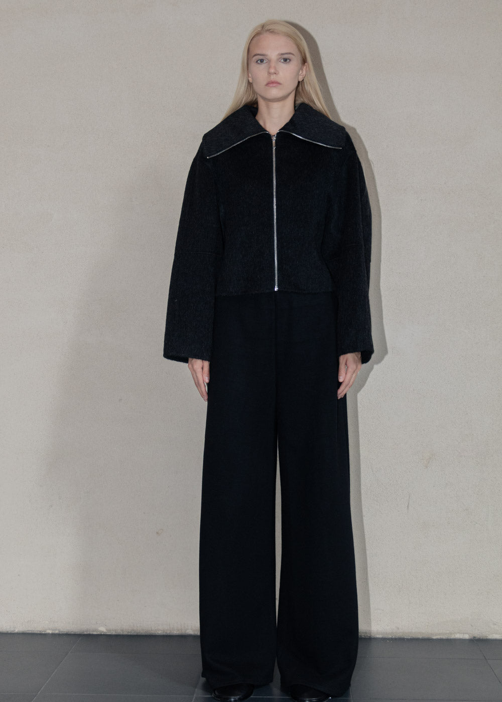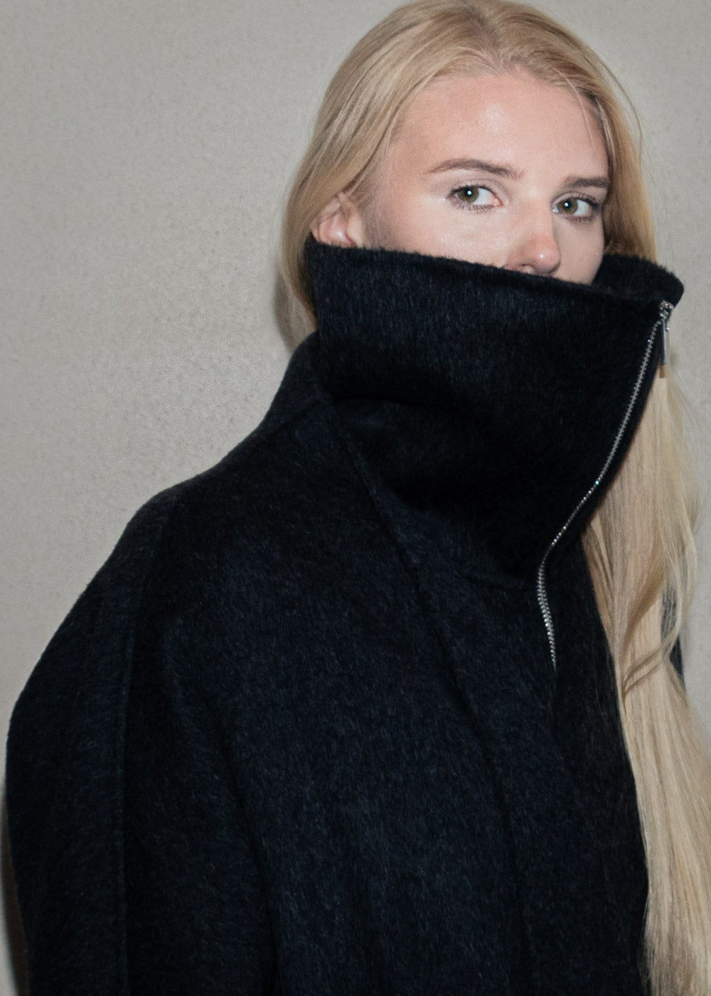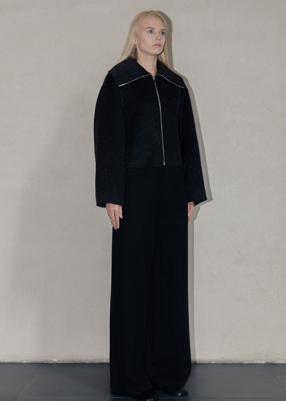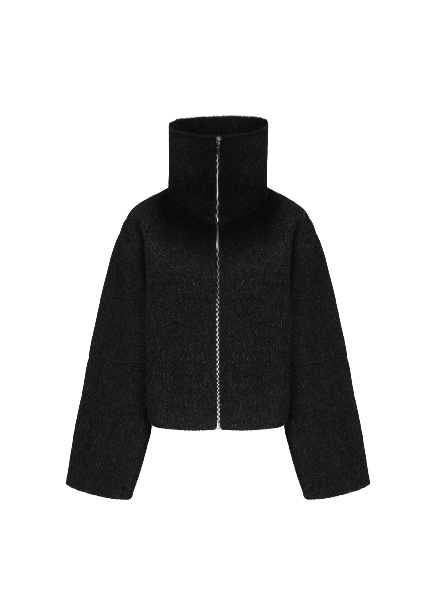 Handcrafted from a double-faced fabric blend of merino wool, rabbit fur, and alpaca wool, the wide sleeves and high-neck with extended zipper showcase a structured, modern silhouette that perfectly blends warmth, softness, and style.