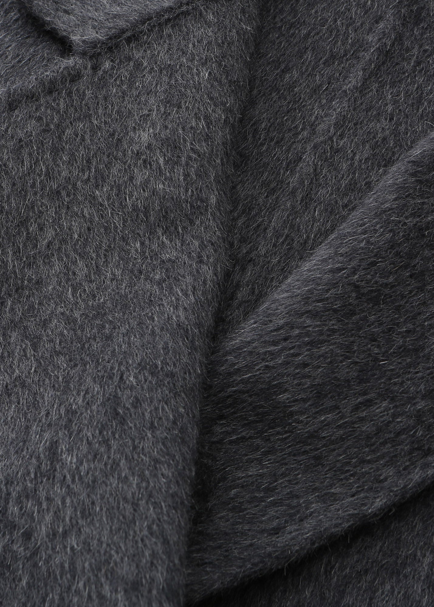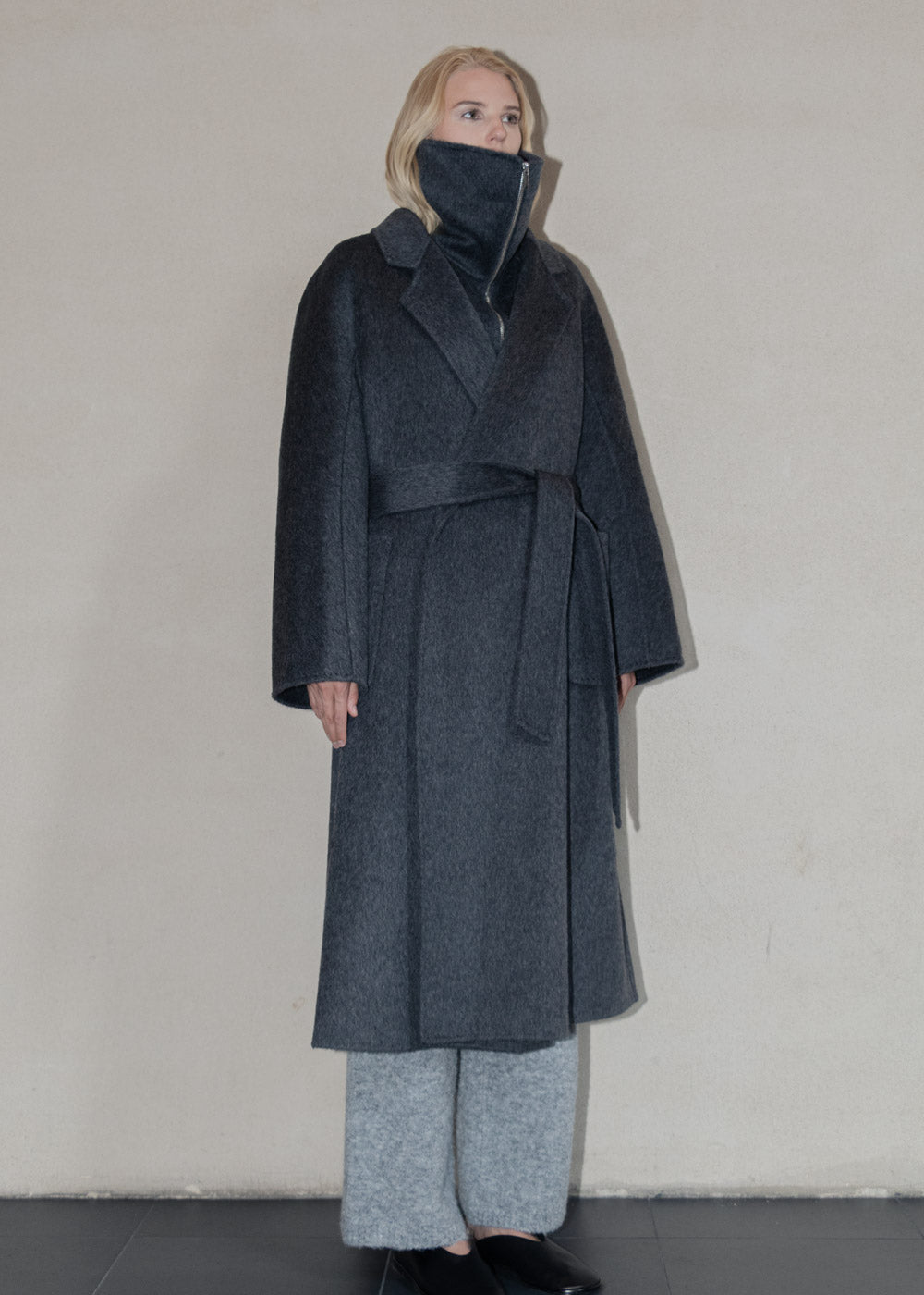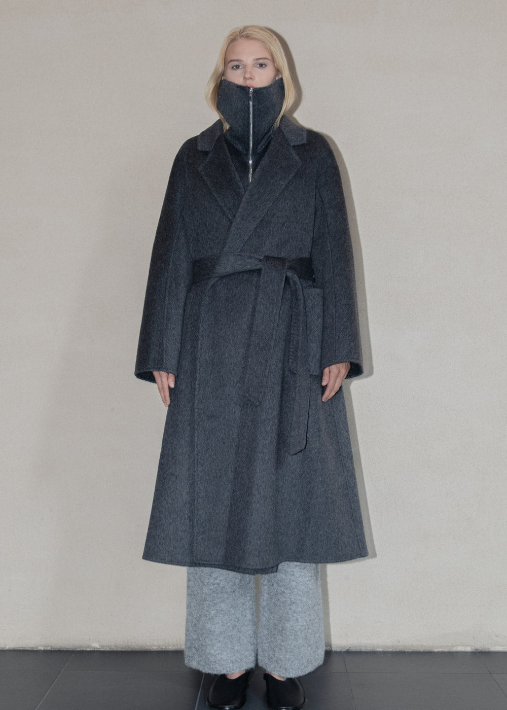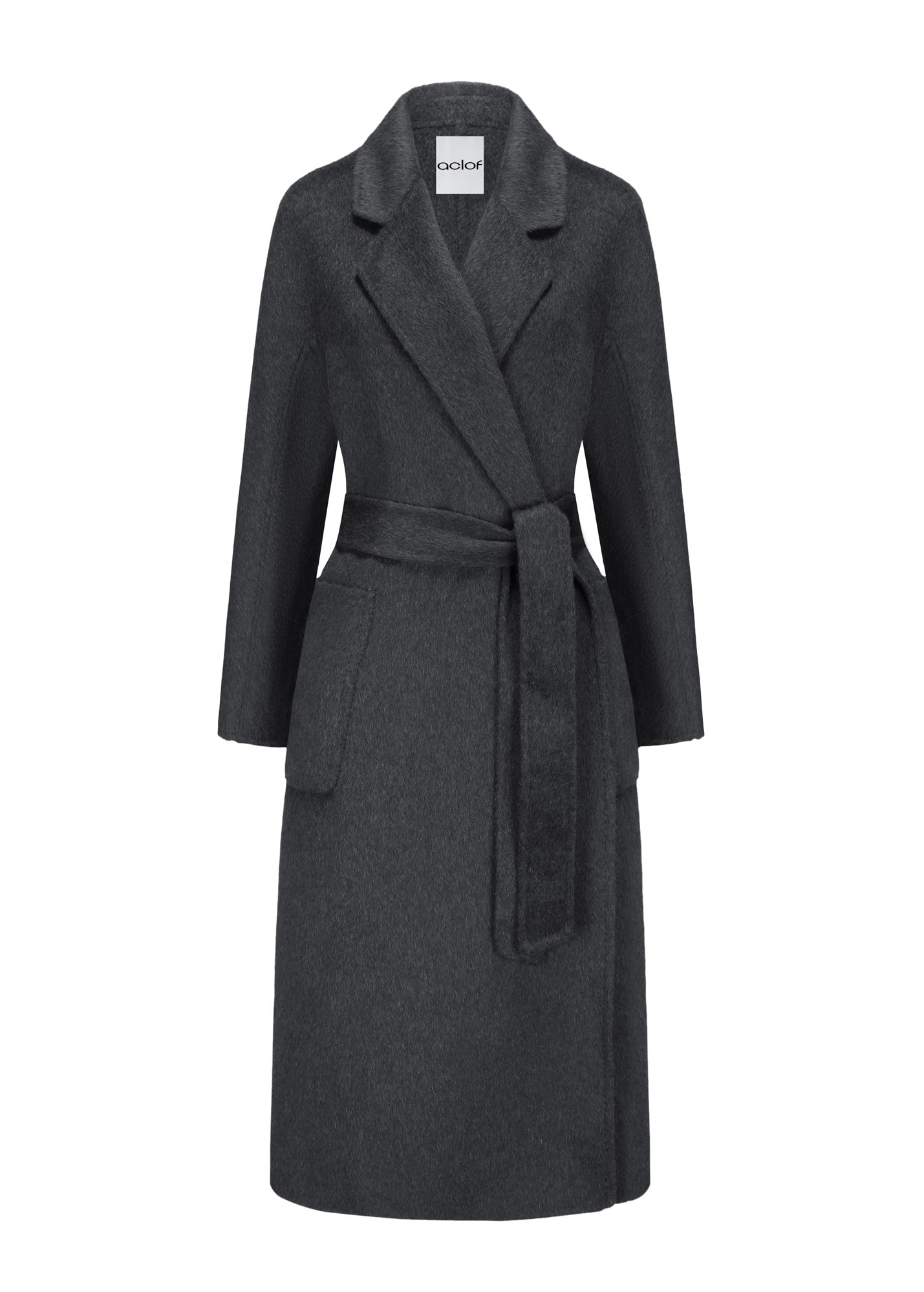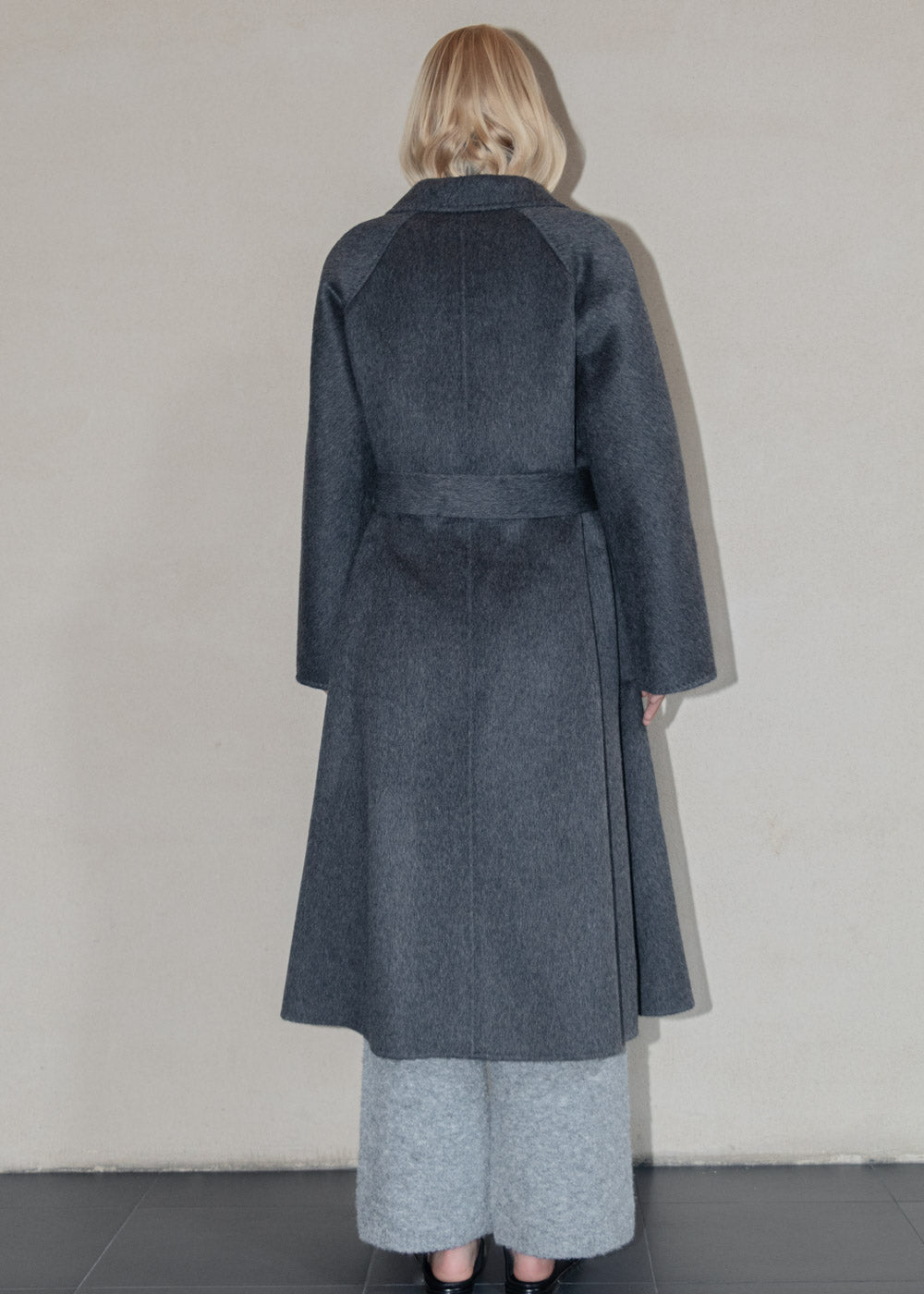 Handcrafted from a double-faced fabric blend of merino wool, rabbit fur, and alpaca wool, this long coat features a belted waist and minimalist design, combining warmth, elegance, and versatile style for fall and winter.