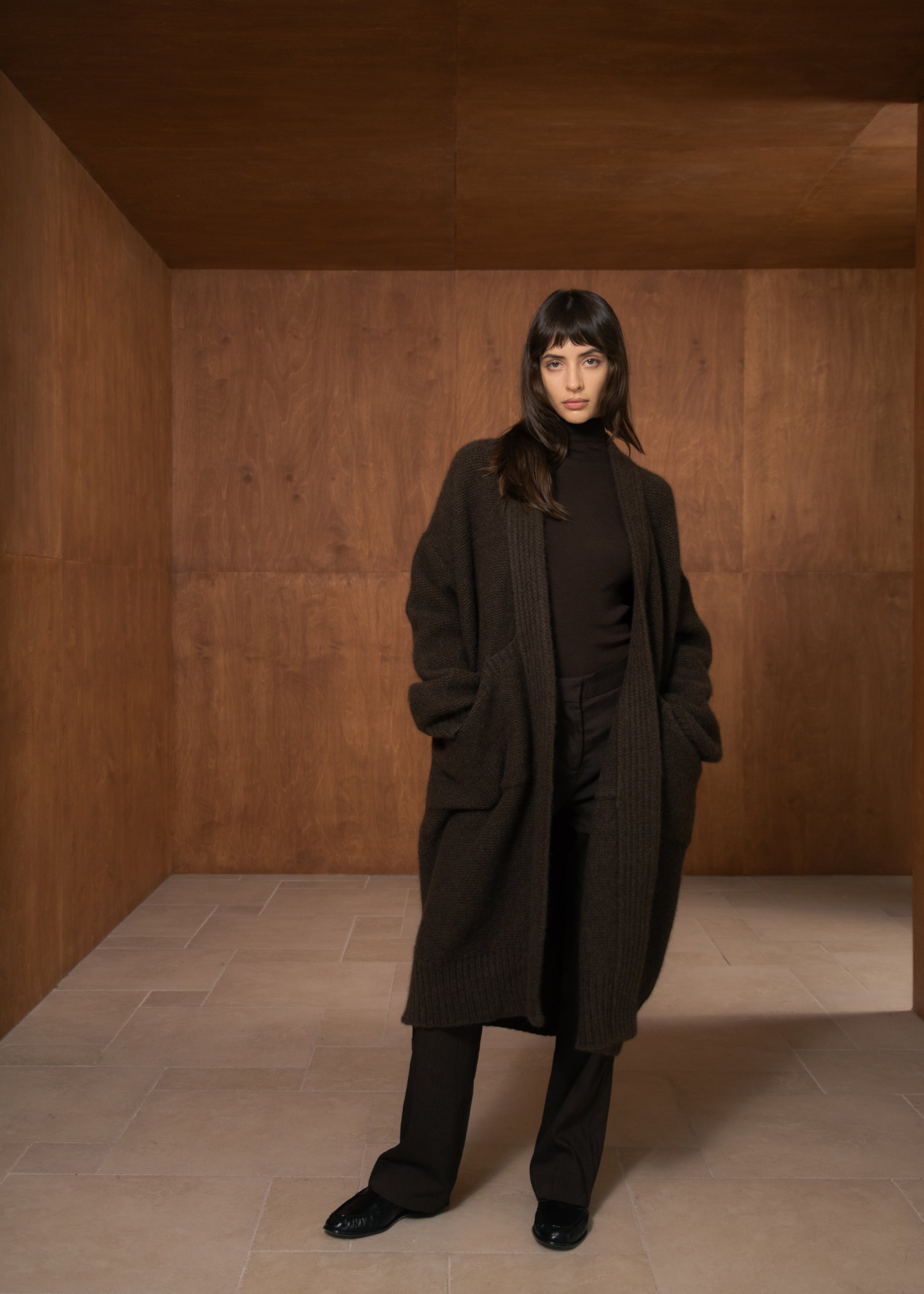 A luxurious robe-style cardigan crafted from yak down fabric, blending timeless elegance with cozy warmth. Perfect for layering in every season.