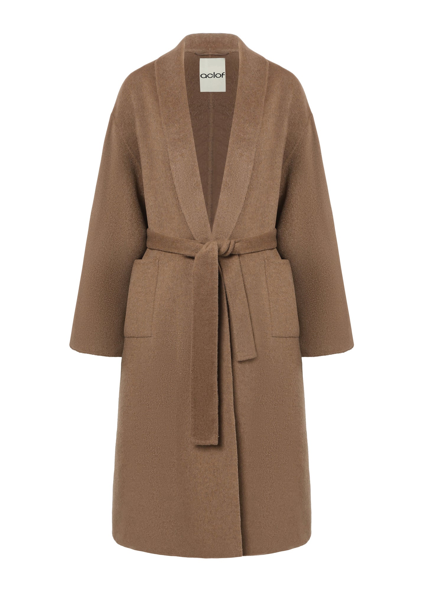 Knee-length warp coat in hand-sewn double-faced wool, cashmere, and lyocell with notched lapel collar, oversized patch pockets, and refined tailored finish.